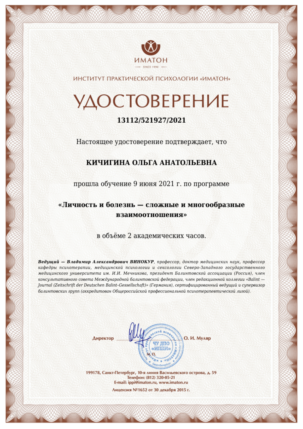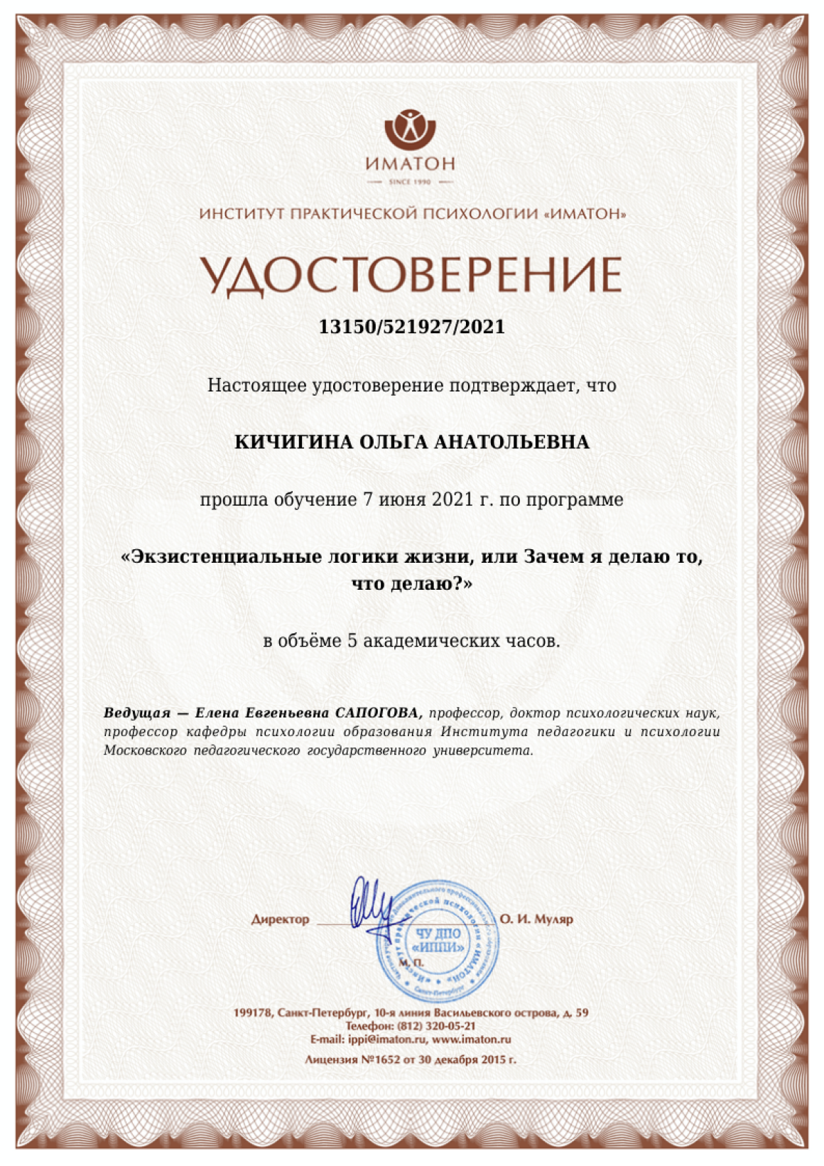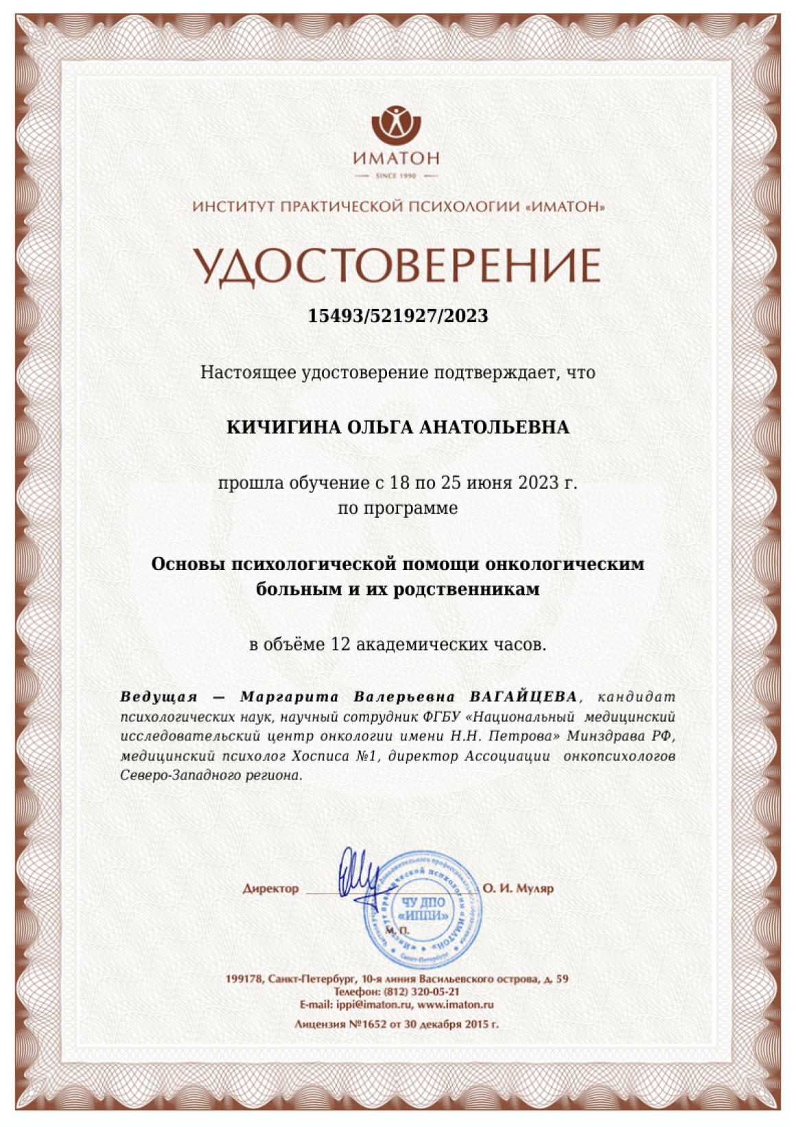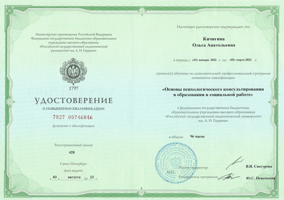 Дополнительные навыки для практической работы были получены на программе повышения квалификации по психологическому консультированию в РГПУ им. А. И. Герцена (2022 г.).