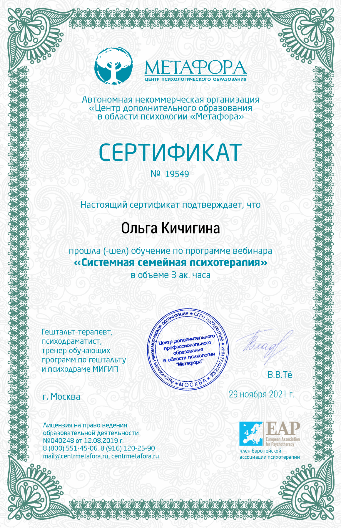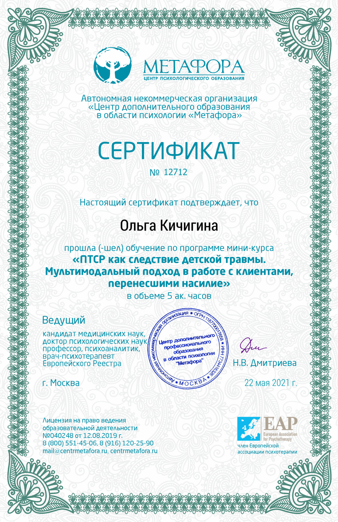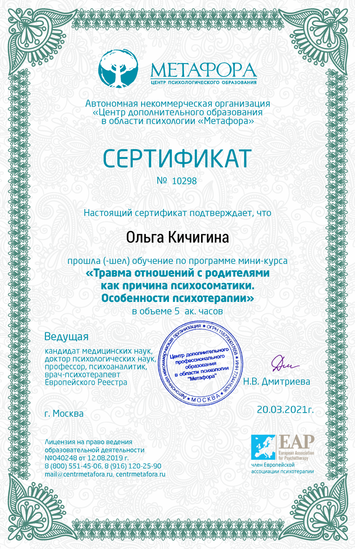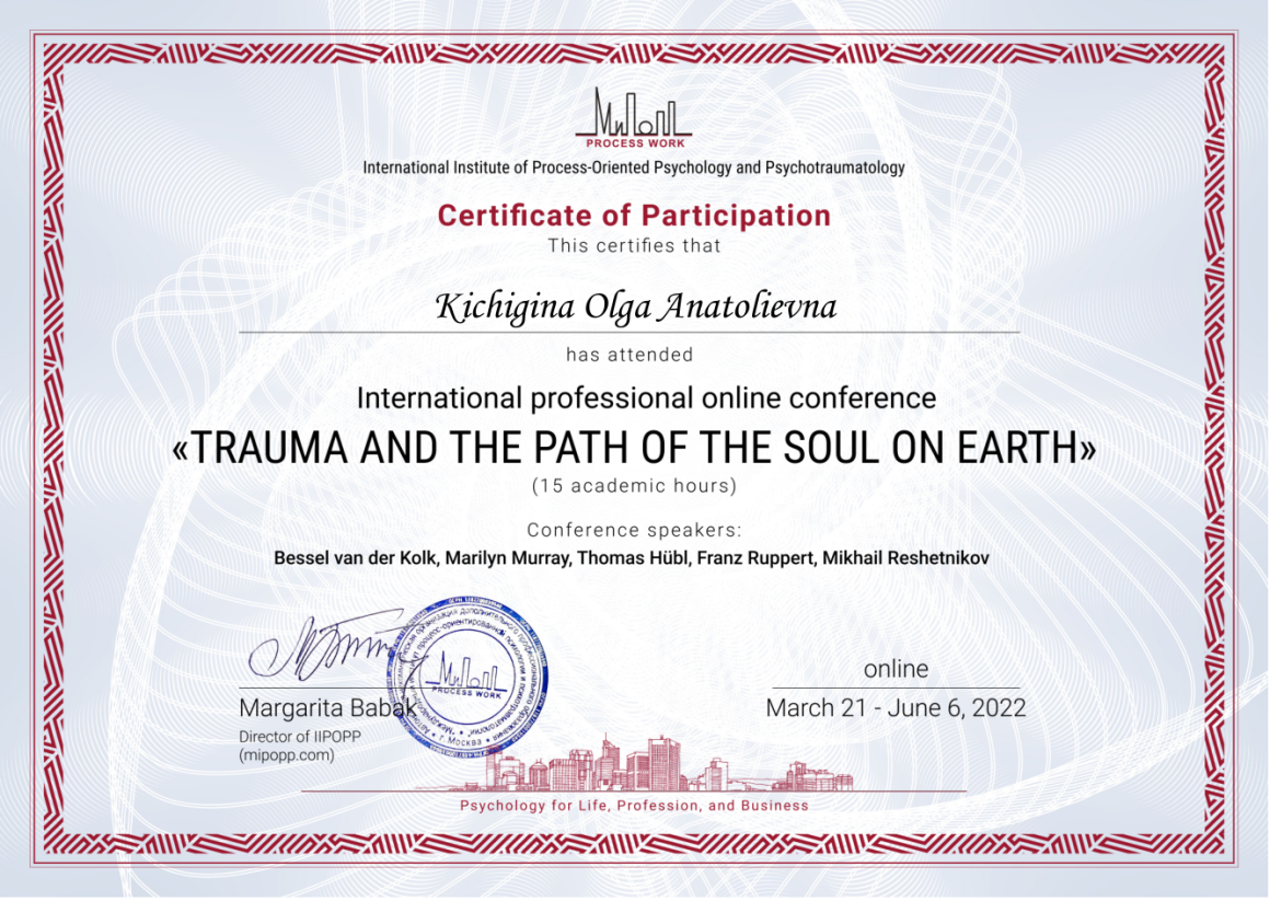 Дополнительные навыки для практической работы были получены на программе повышения квалификации по психологическому консультированию в РГПУ им. А. И. Герцена (2022 г.).