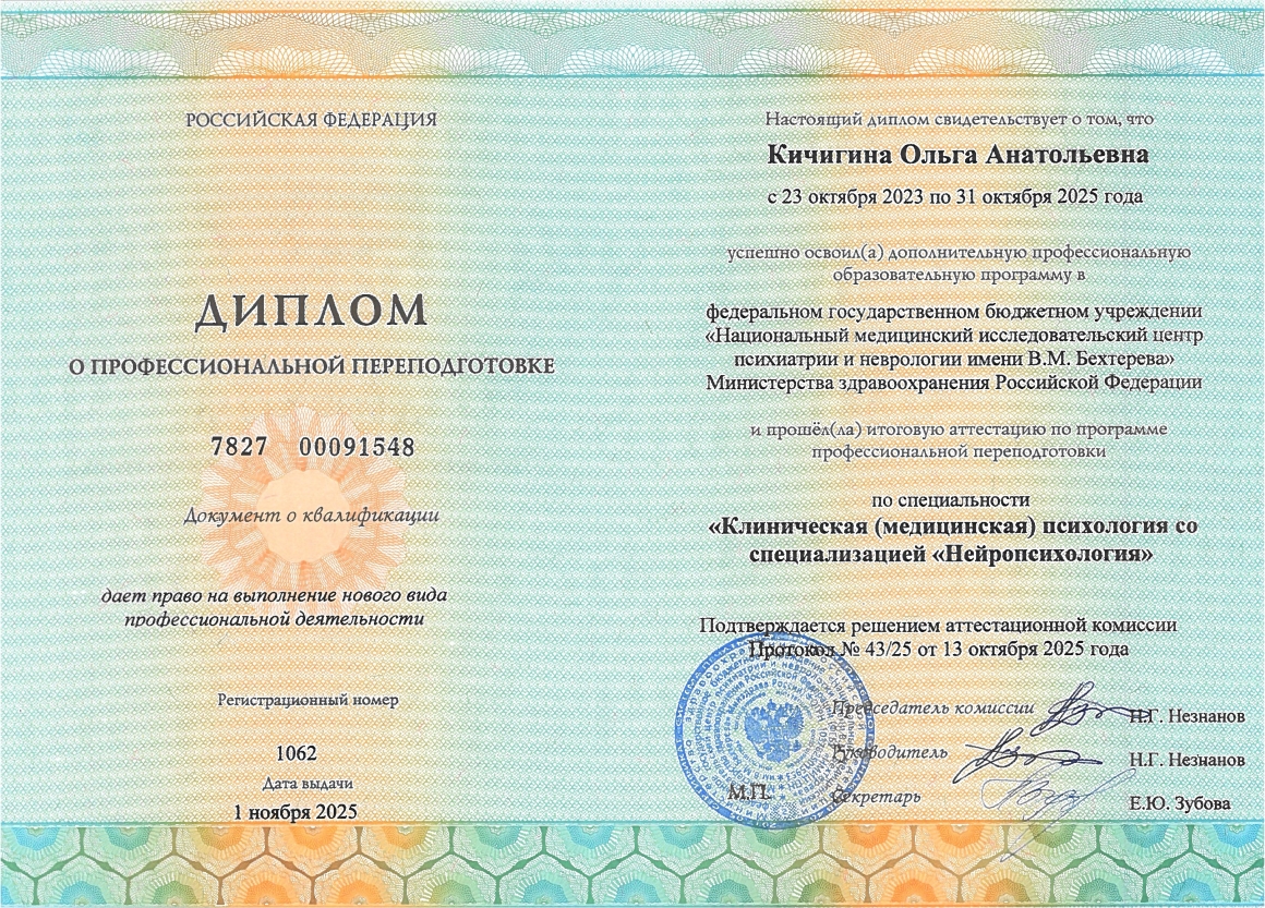 2023-2025 гг. – программа профессиональной переподготовки по специальности клиническая (медицинская) психология со специализацией в нейропсихологии в НМИЦ ПН им. Бехтерева.